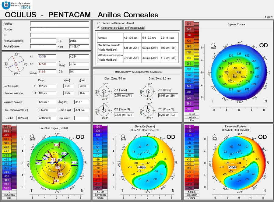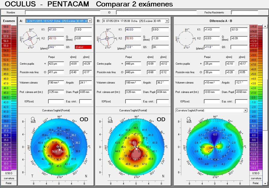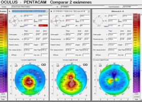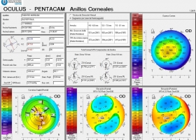 El Pentacam hace un análisis completo de la córnea en 5 segundos, nos provee 138.000 puntos de elevación de toda la córnea, Nos provee información de la forma de la cara anterior, espesor de córnea, forma de la cara posterior, aberraciones de alto orden de la córnea, con altísima sensibilidad de detección de casos muy tempranos de queratocono que se traduce en manejo mucho más adecuado para evitar que empeore. Además con esta información sumada a la del examen oftalmológico podemos decidir el manejo más adecuado individualizado para cada paciente. También nos provee de una forma objetiva la mejor forma de evaluar la evolución del queratocono, y determinar progresión, estabilidad o mejoría con el tratamiento.